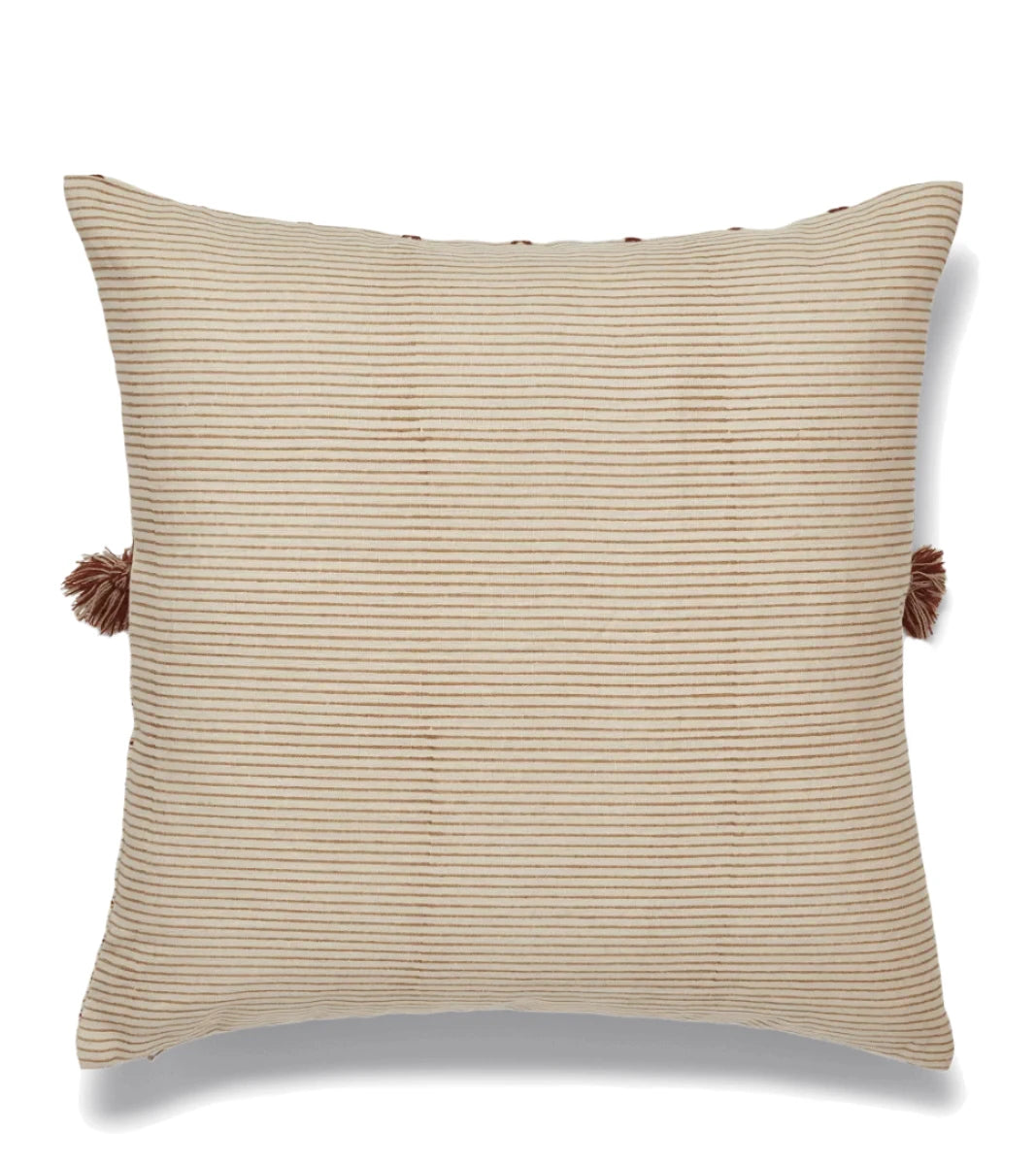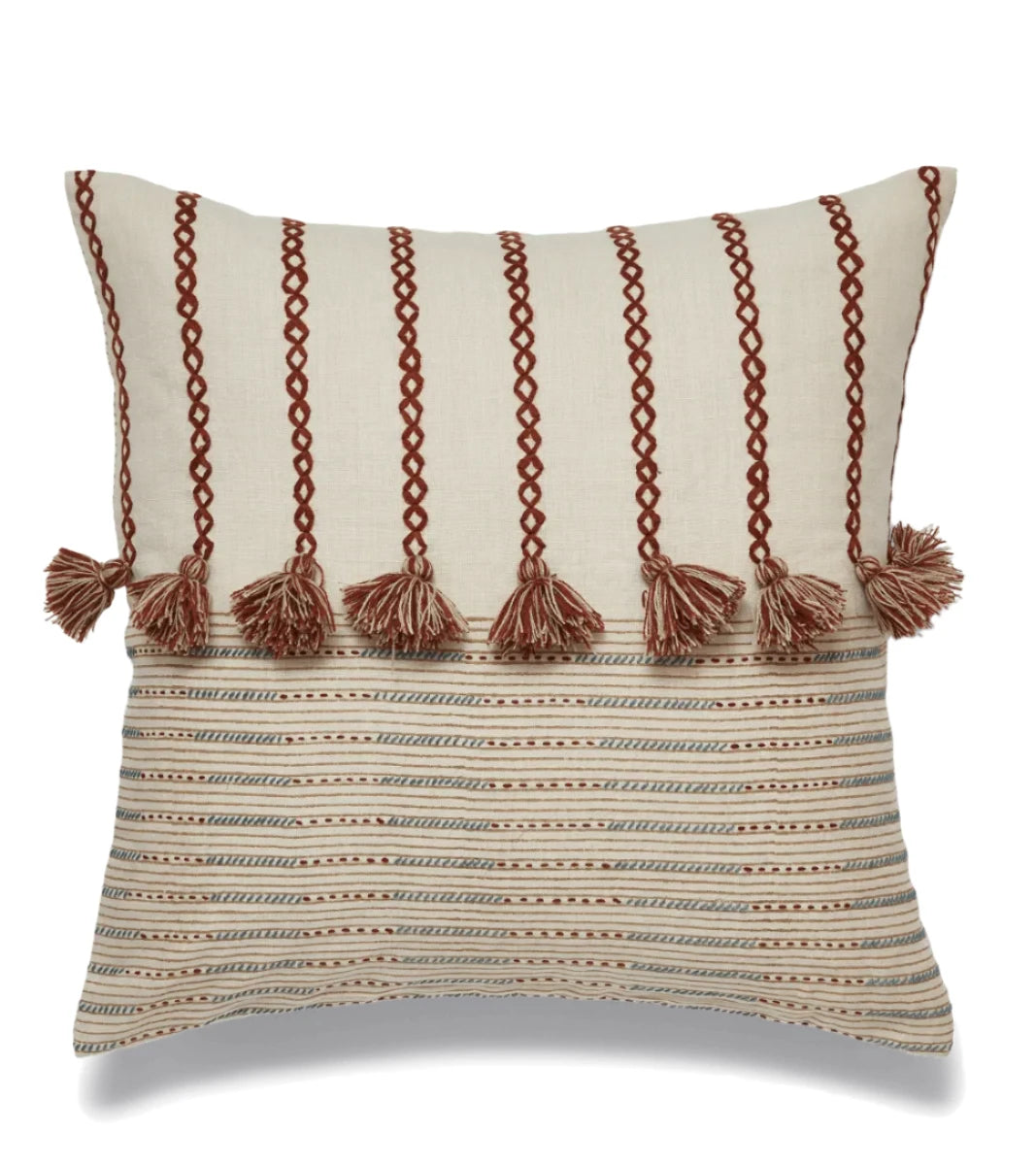 Embellishment always adds a touch of personality, and none more so than the adornments on the Morse Cushion Cover. The 100% linen cover is hand block printed; the beauty of this technique is that each print will differ ever so slightly, depending on the amount of pressure applied by the artisan. It features hand embroidery that ends in unique chunky knotted tassels for added texture and colour.
